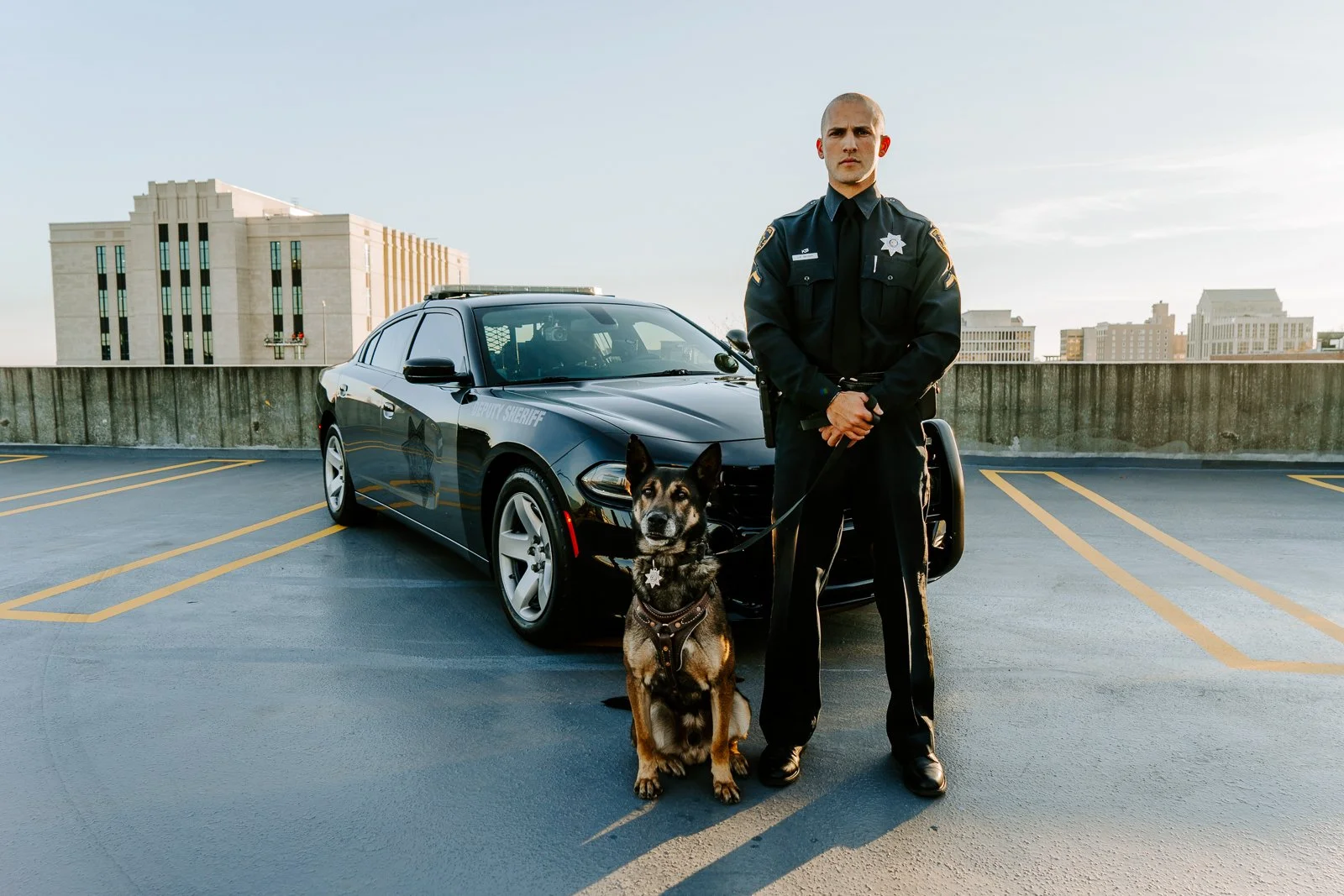 A police officer standing with a K-9 in front of a squad car on a parking garage roof with the city scape at sunset behind him.