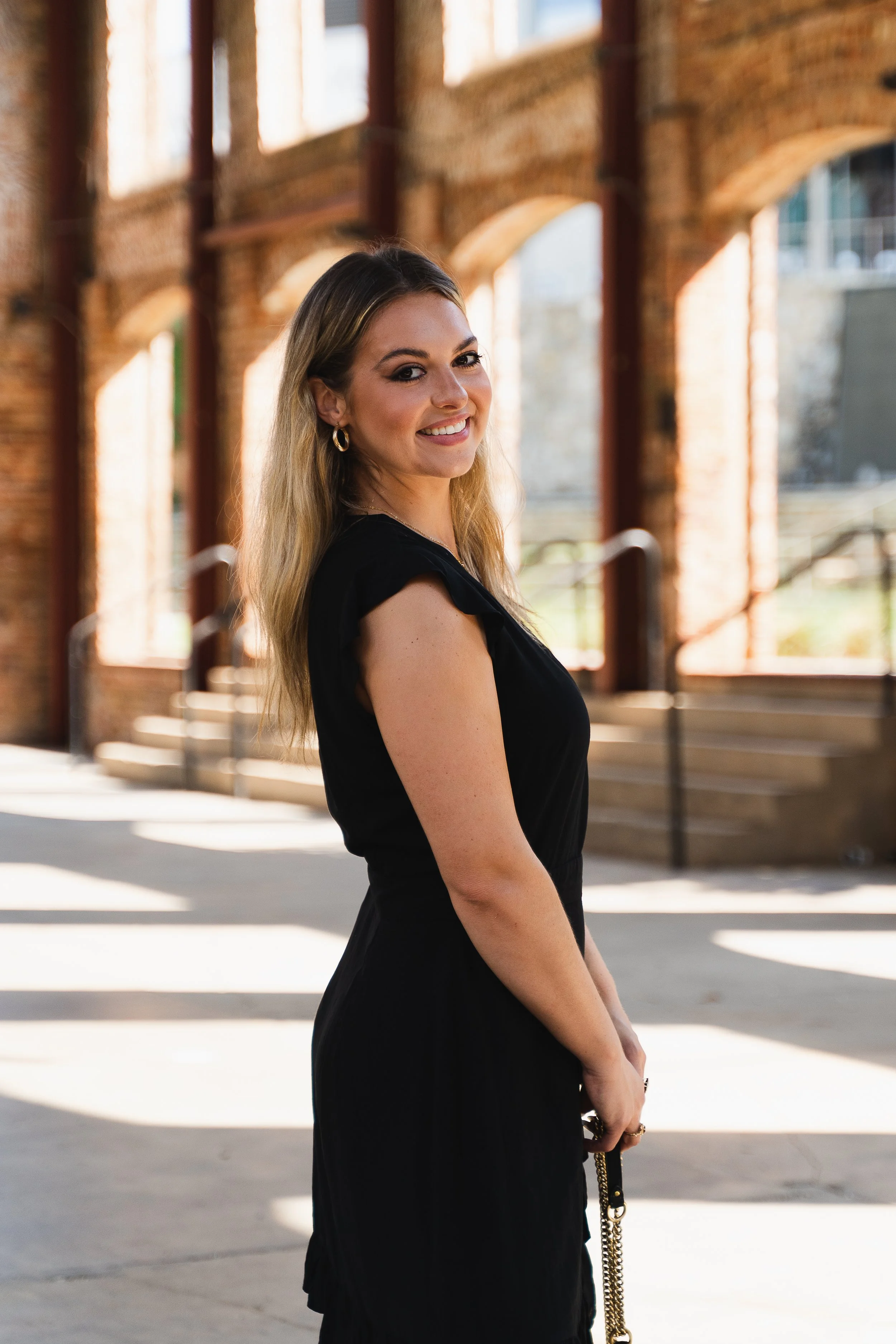 A young woman in a black dress standing outdoors in front of a brick building, smiling and holding a small purse with a chain strap.