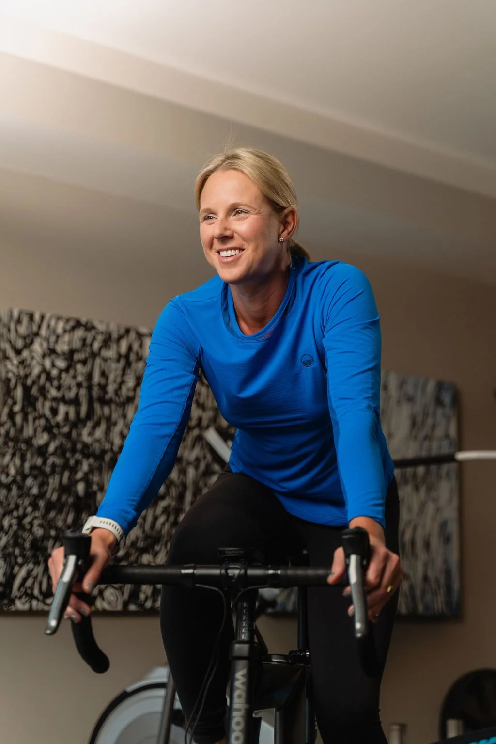 A woman in a blue long-sleeve athletic shirt riding a stationary bike indoors.