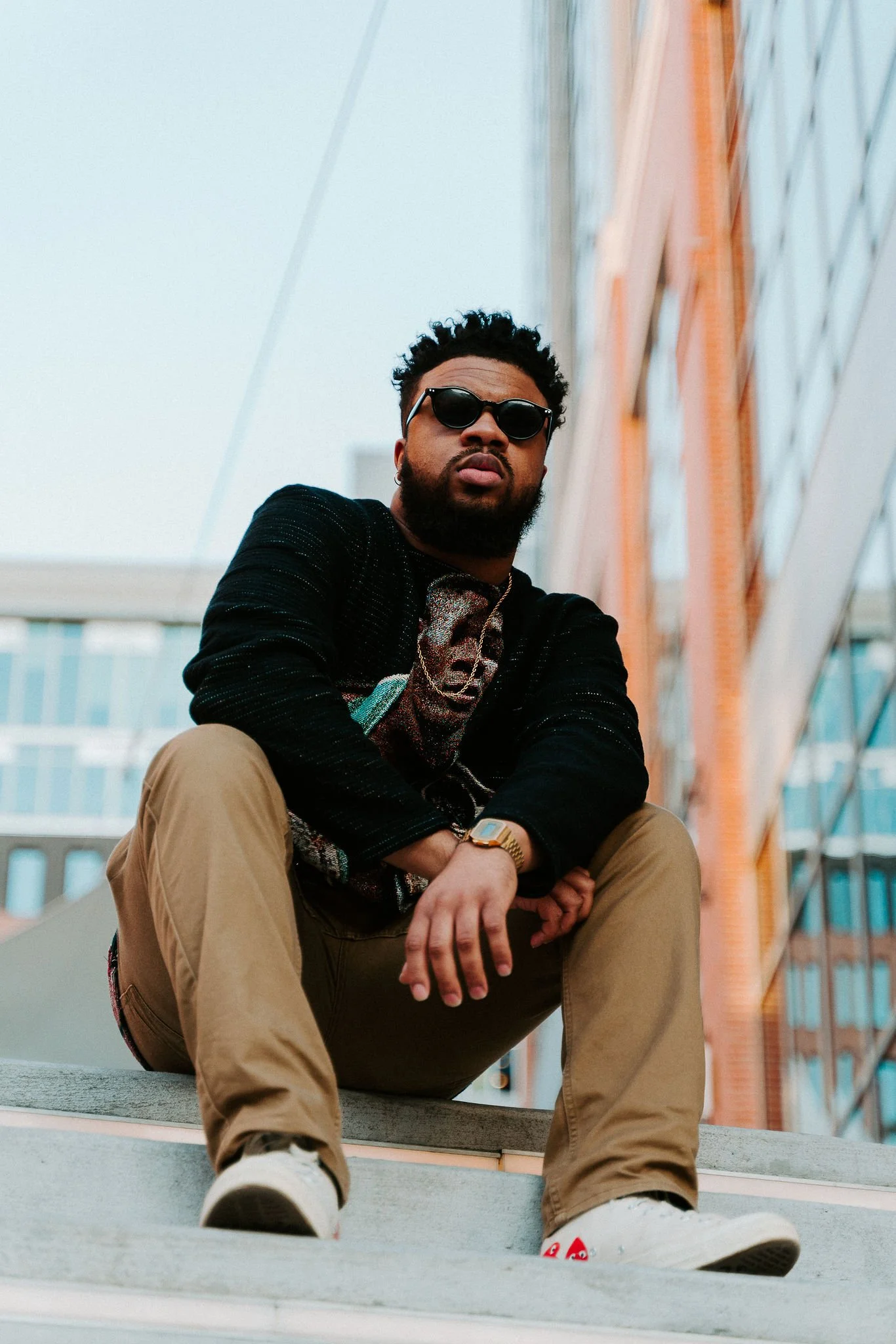 A man in white shoes, khakis, black sweater and sunglasses sitting in front of a modern urban background.