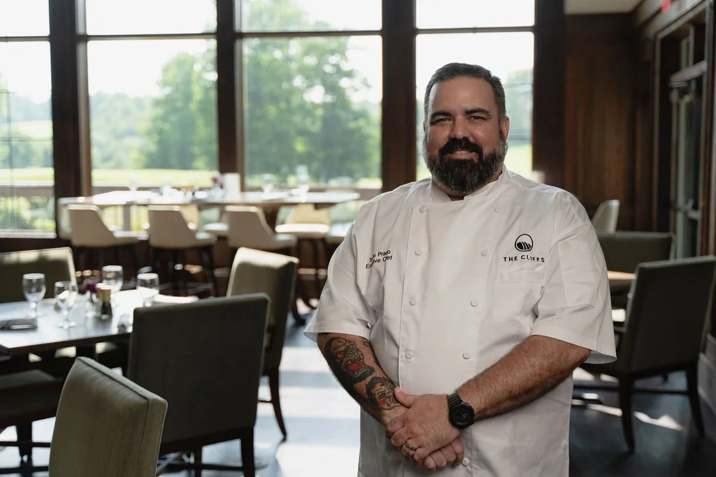 A man with a beard wearing a white chef's coat, standing in a restaurant dining area with large windows and outdoor scenery visible.