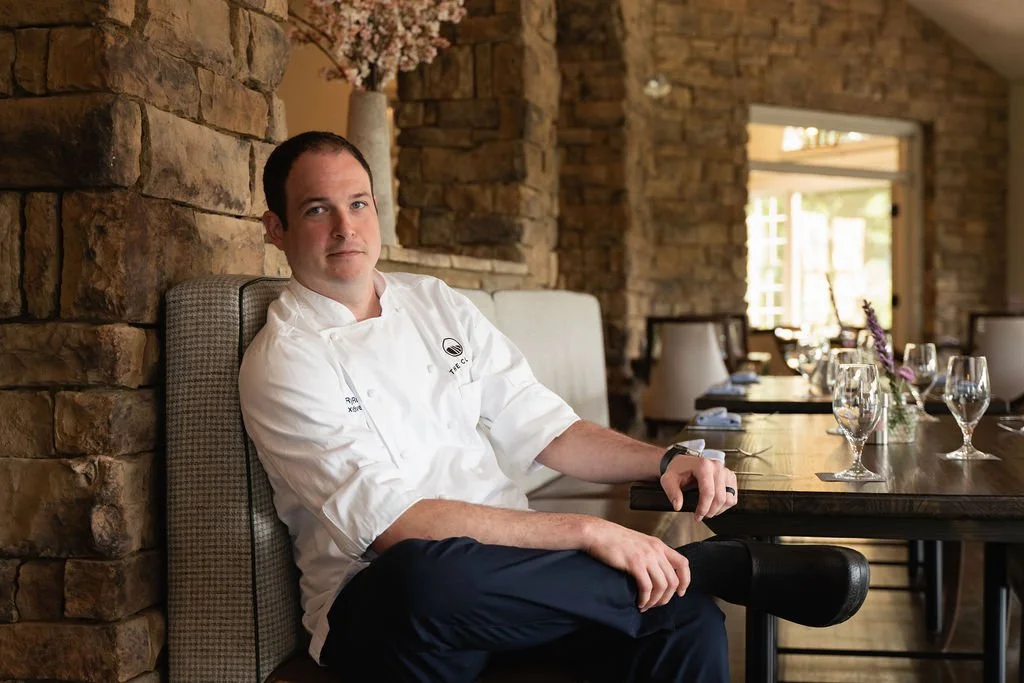 A male chef in a white chef's coat seated in a dining room set with wine glasses and napkins, with stone walls and large windows in the background.