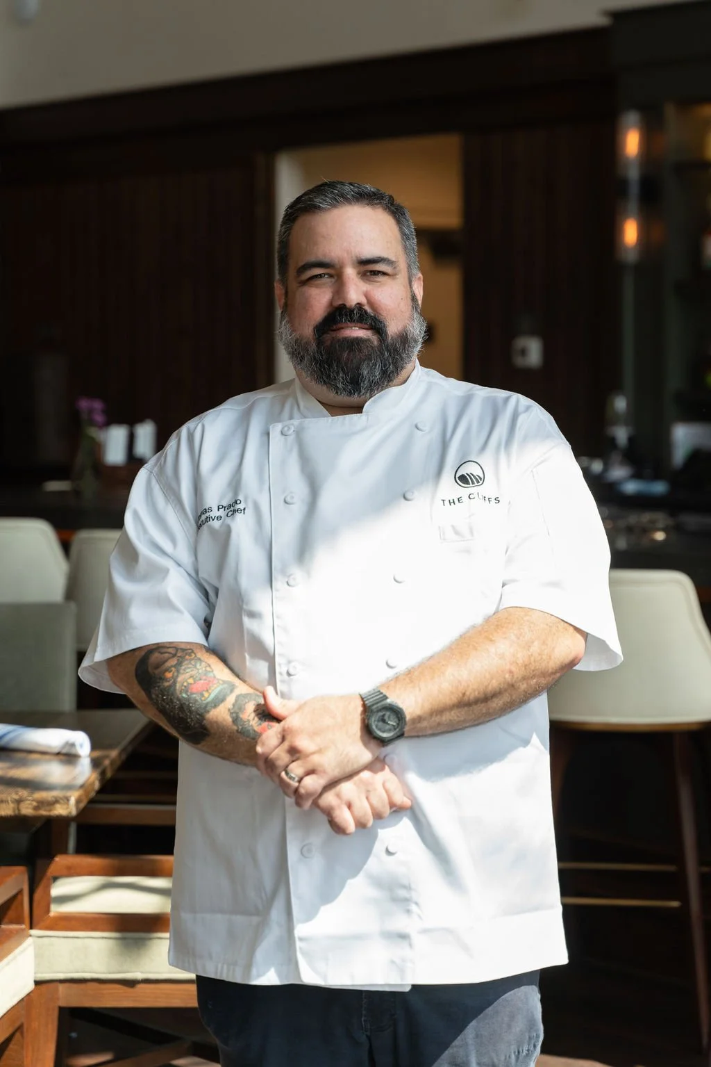 A male chef in a white chef's jacket standing in a dimly lit wooden interior, with arched doorways in the background.