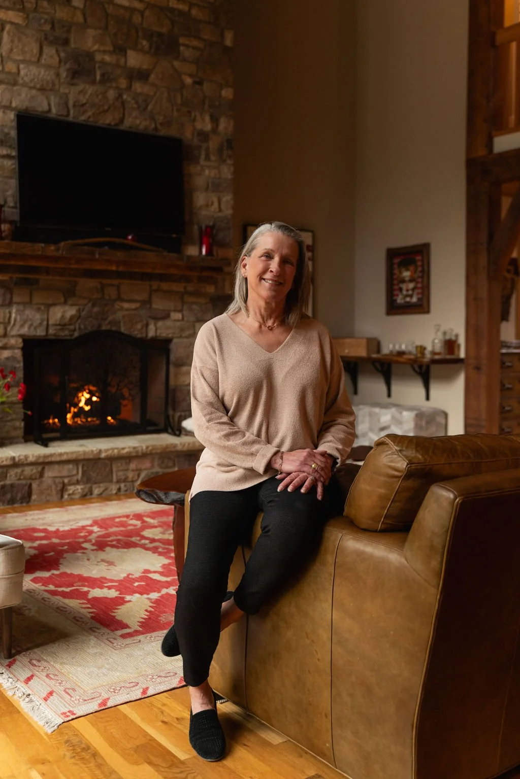 A woman sitting on a leather ottoman in a cozy living room with a stone fireplace, a burning fire, and a wall-mounted television, smiling at the camera.