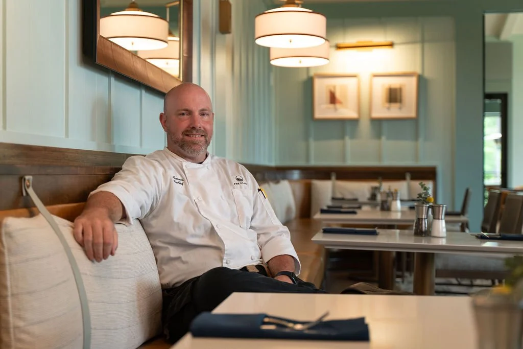 A male chef in a white chef's jacket standing in a restaurant with wooden walls, large windows, and tables set with black napkins, glassware, and utensils.