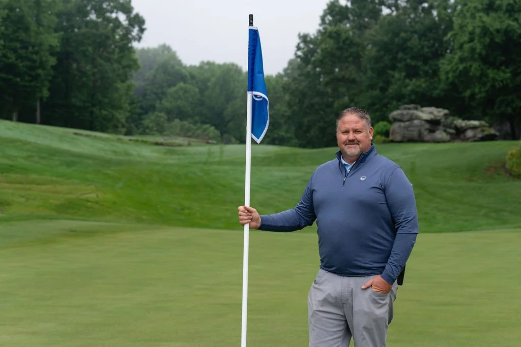 Man in blue long-sleeve holding a blue golf flag on a golf course on a foggy day.