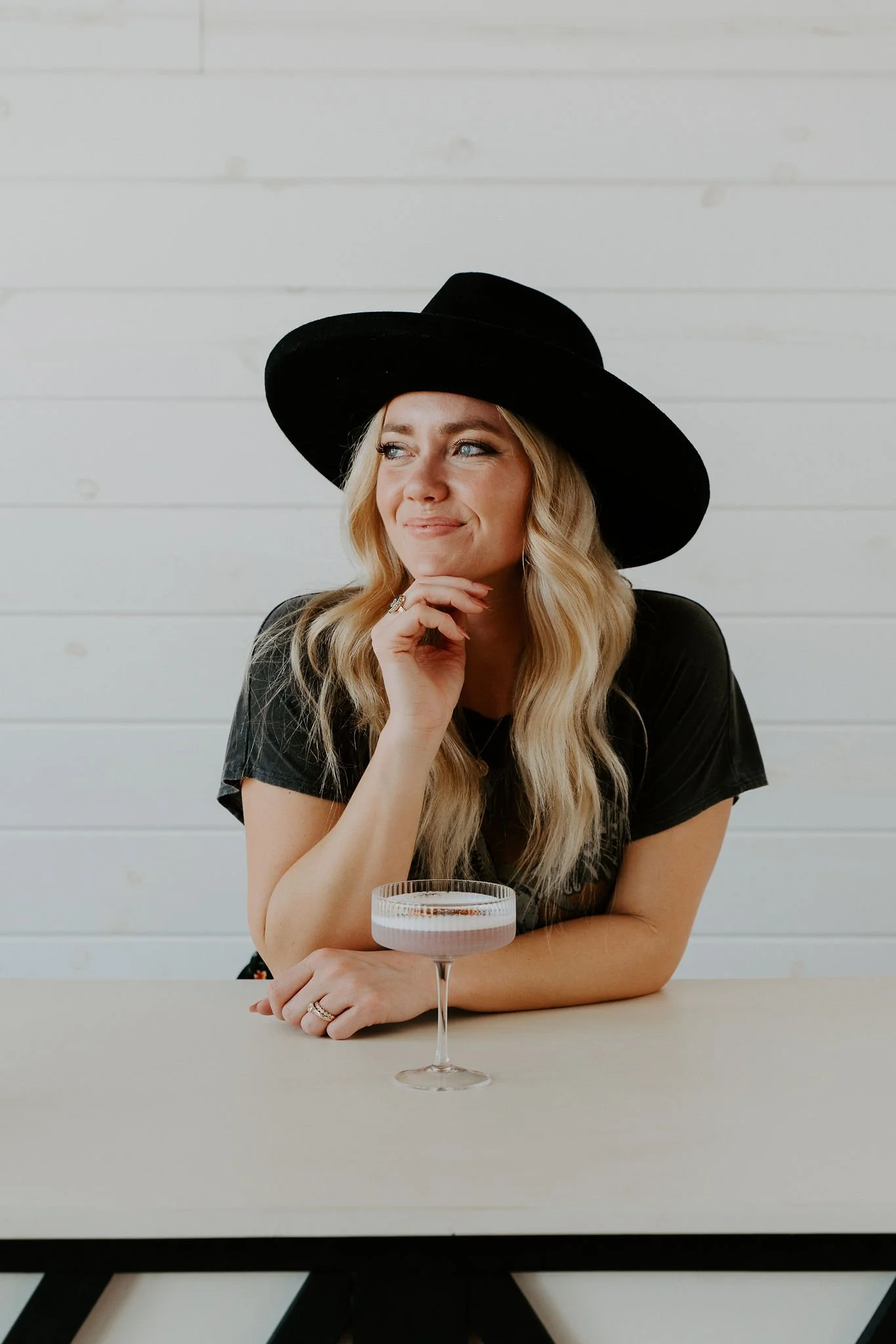 A blonde woman wearing a black hat, shirt, boots and floral skirt, on a barstool, holding a cocktail in front of a white backdrop.