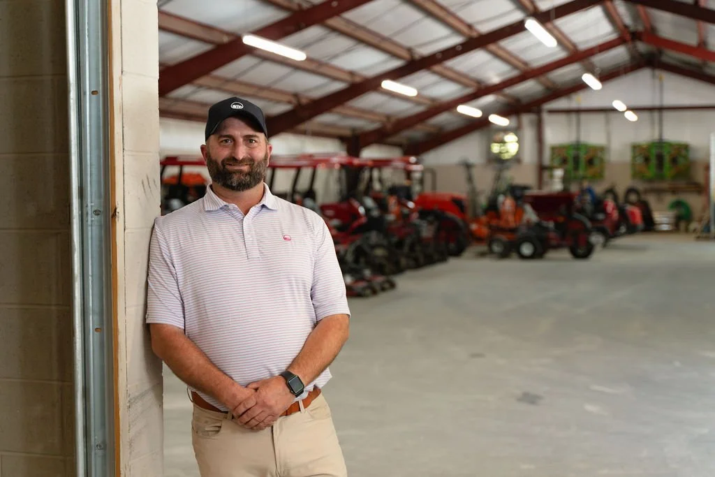 Man in a red shirt and khakis, leaning on a tractor in a warehouse filled with more tractors behind him.