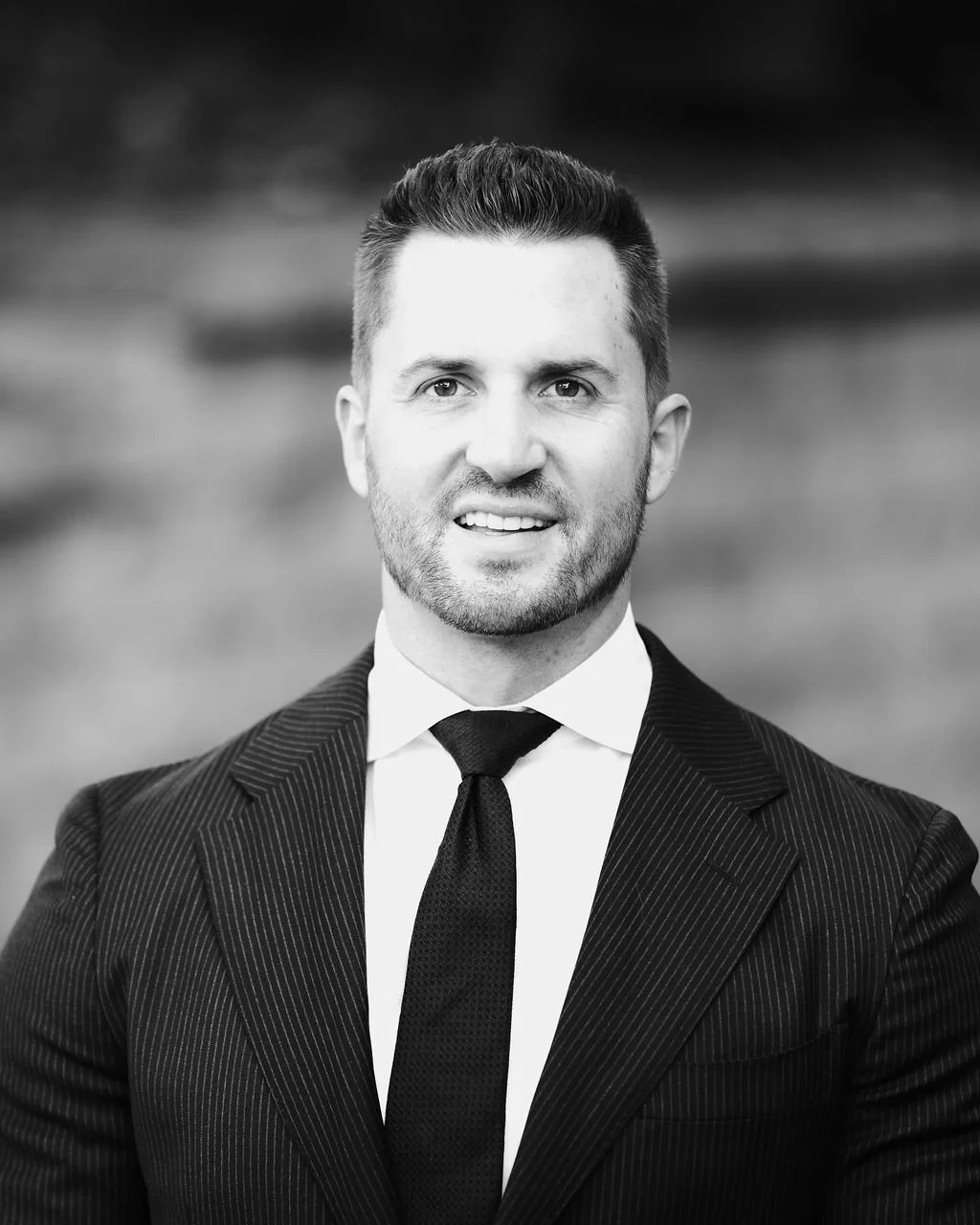 Black and white headshot of a young man in a suit and tie, smiling outdoors with a blurry background.