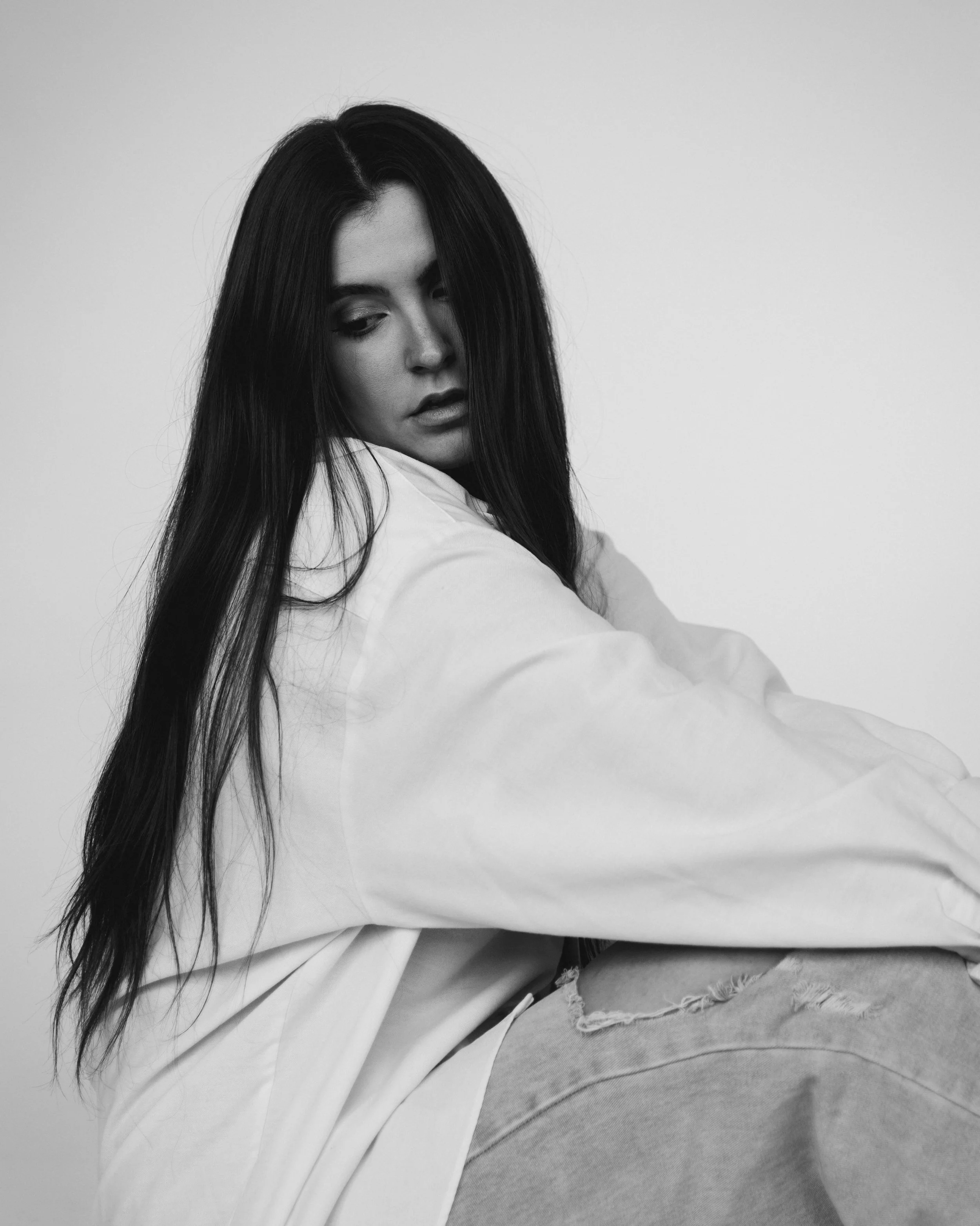 Black-and-white portrait of a woman with long dark hair, wearing a white shirt and ripped jeans, seated and looking down.