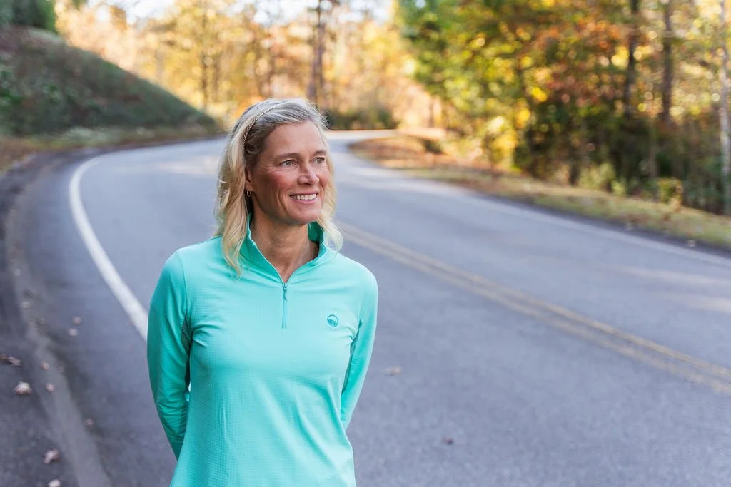 A woman in a light blue athletic top standing on a winding forest road with autumn foliage in the background.