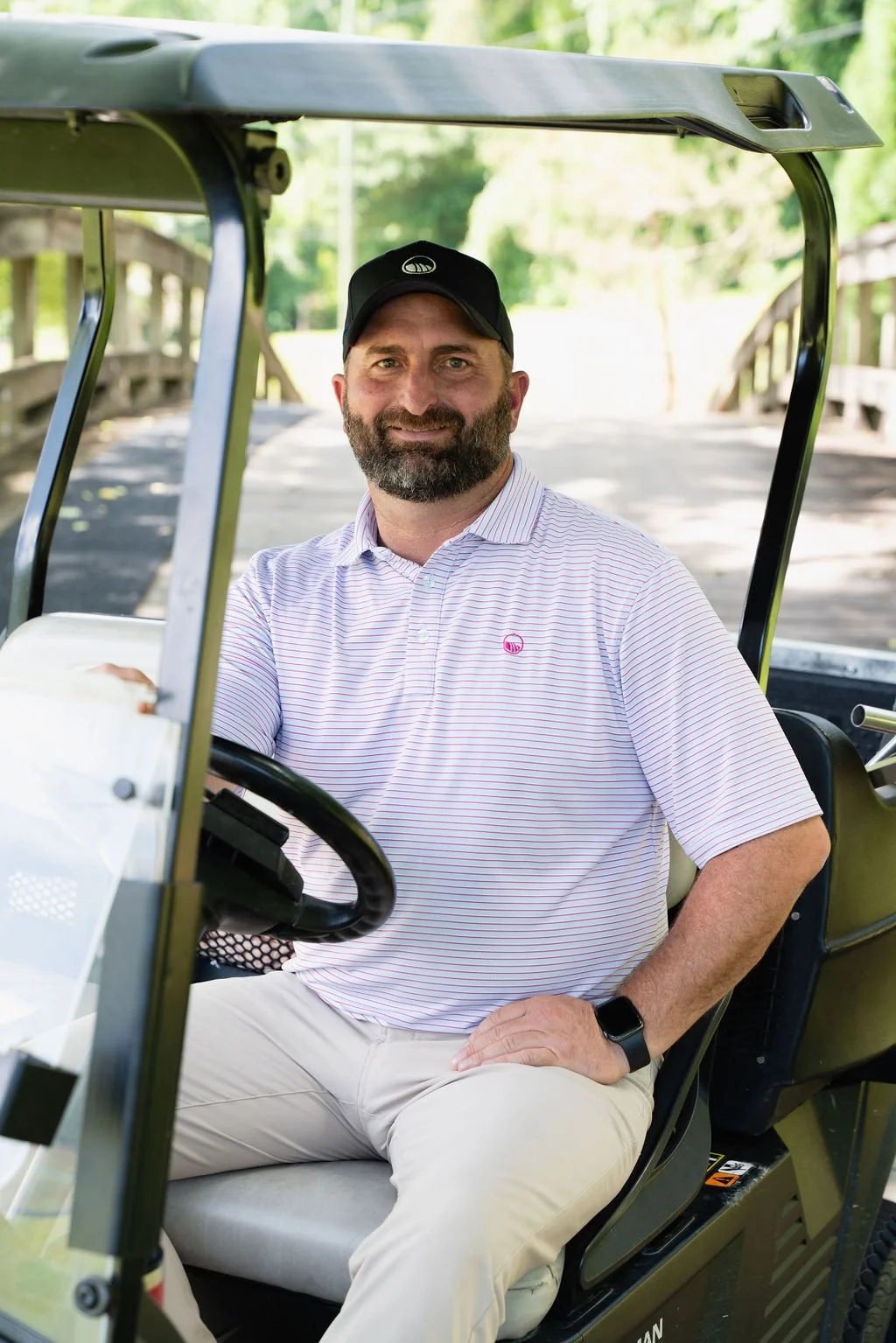 A man with a beard, wearing a black cap and a striped polo shirt, sitting in a golf cart on a golf course, smiling at the camera.