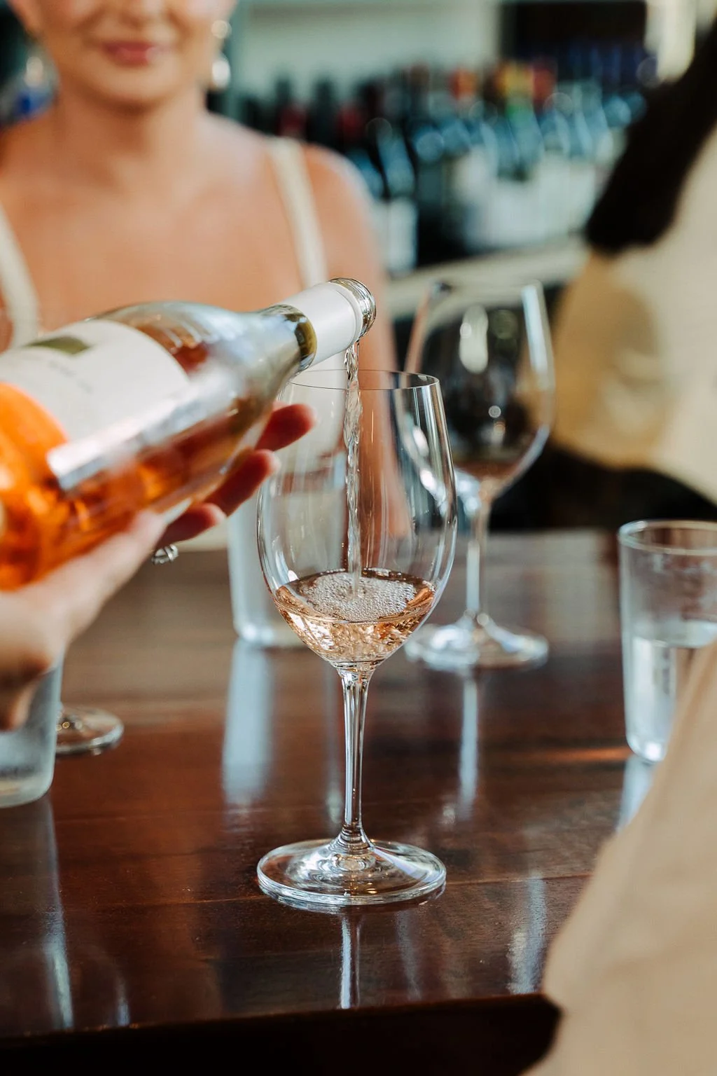 Rosé wine being poured into a glass at a dining table with other glasses and a woman smiling in the background.