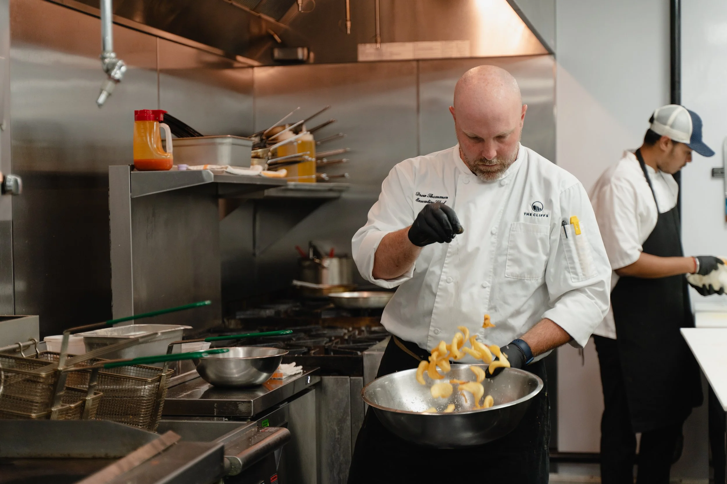 A professional chef cooking in a restaurant kitchen with another chef working in the background.