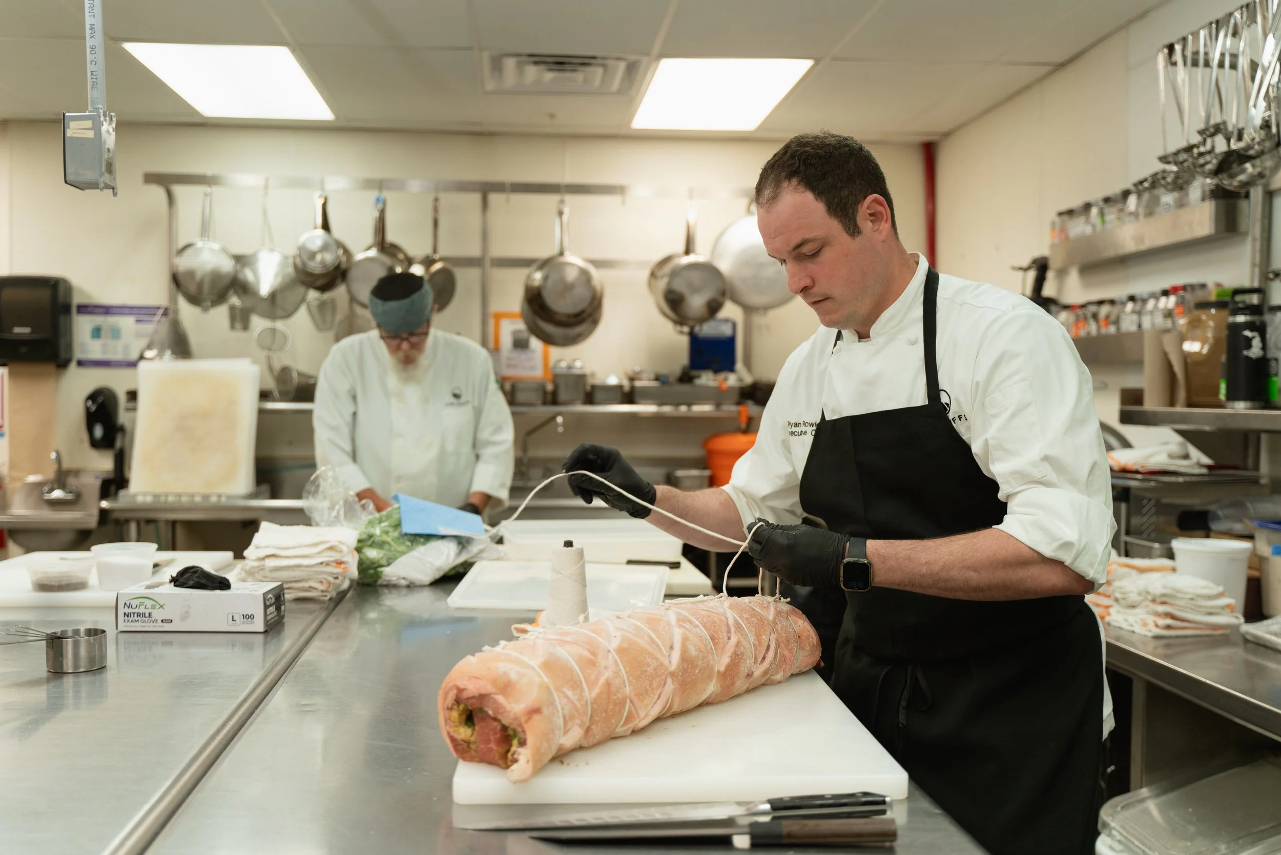 Two chefs working in a restaurant kitchen, the chef in the foreground is preparing a rolled dish that he's tying.