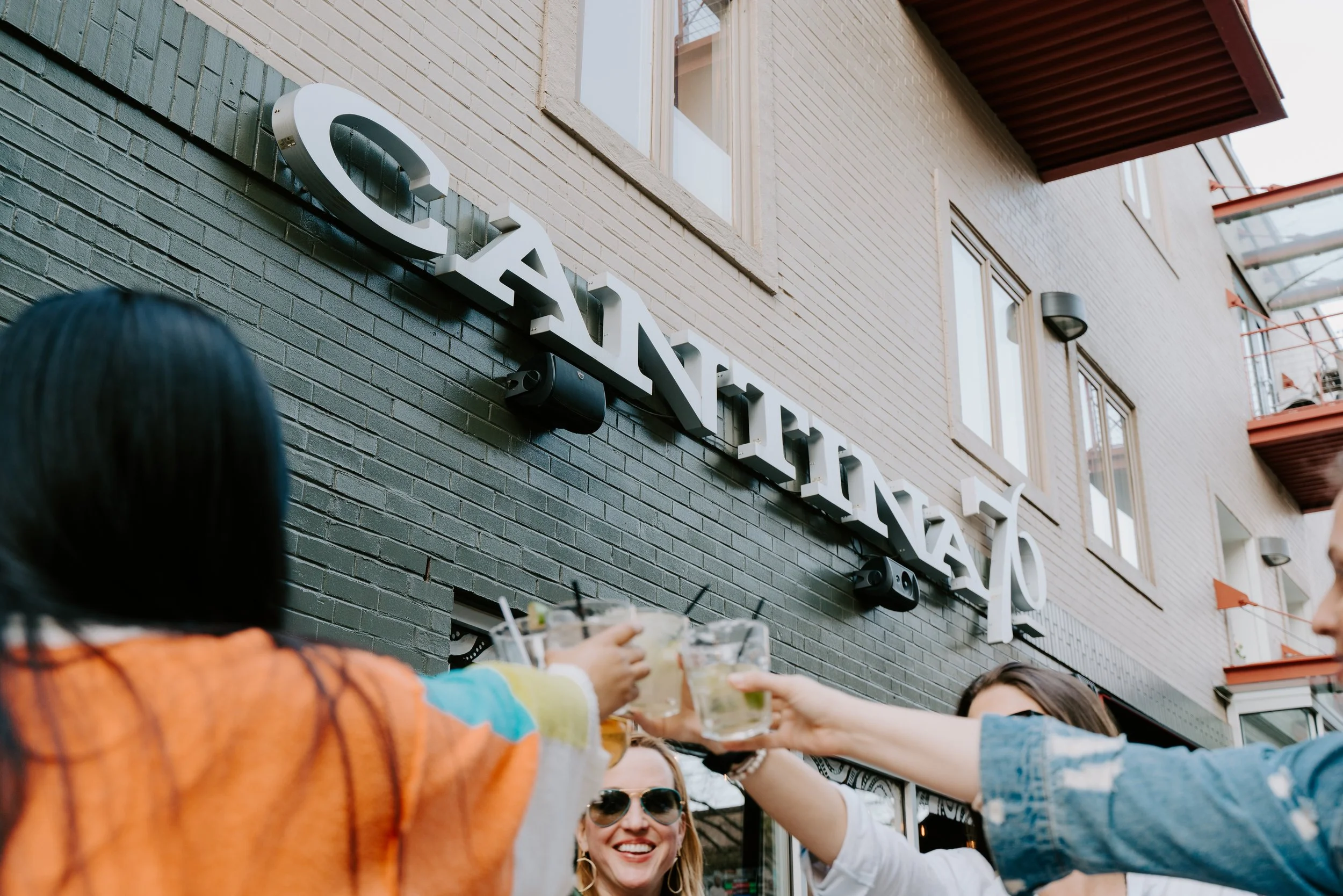 People toasting with drinks outside of a restaurant with the name on a brick wall behind them.