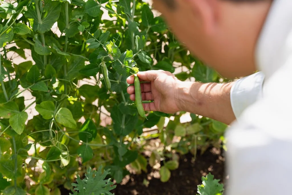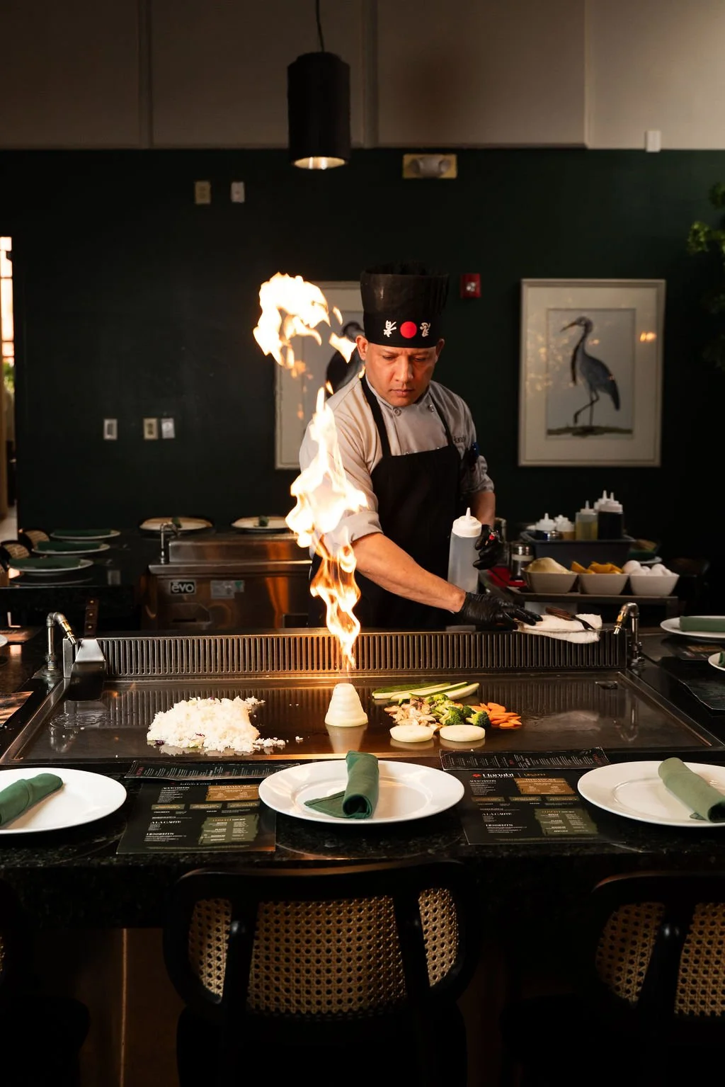 Chef cooking on grill surrounded by family style seating with a green wall and artwork of herons behind him.