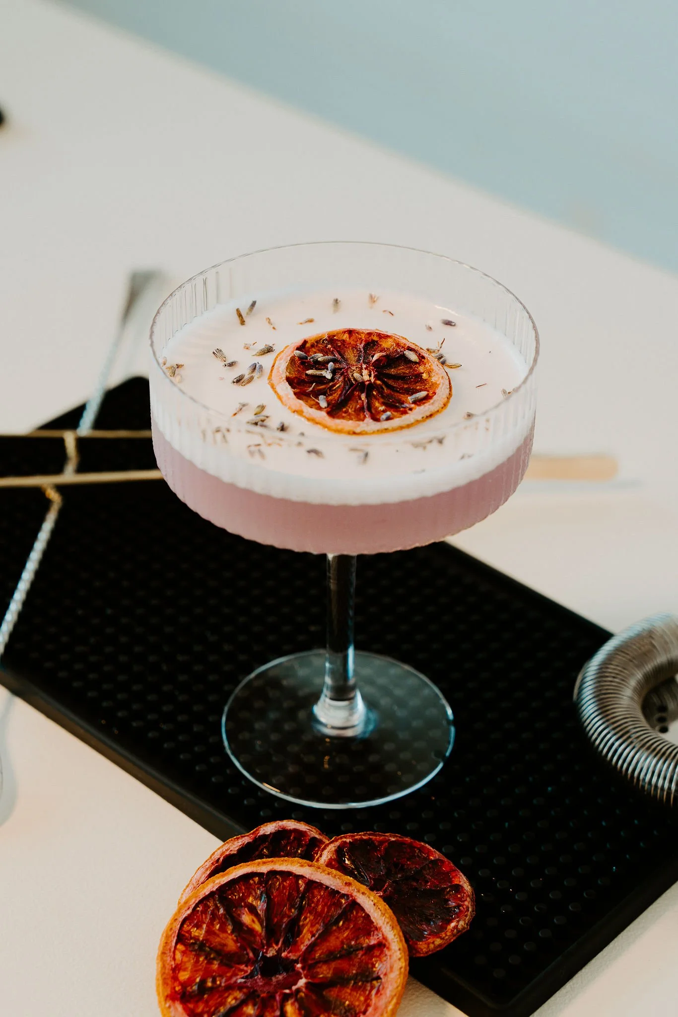 Pink cocktail in a coupe glass garnished with dried orange slice and lavender seeds