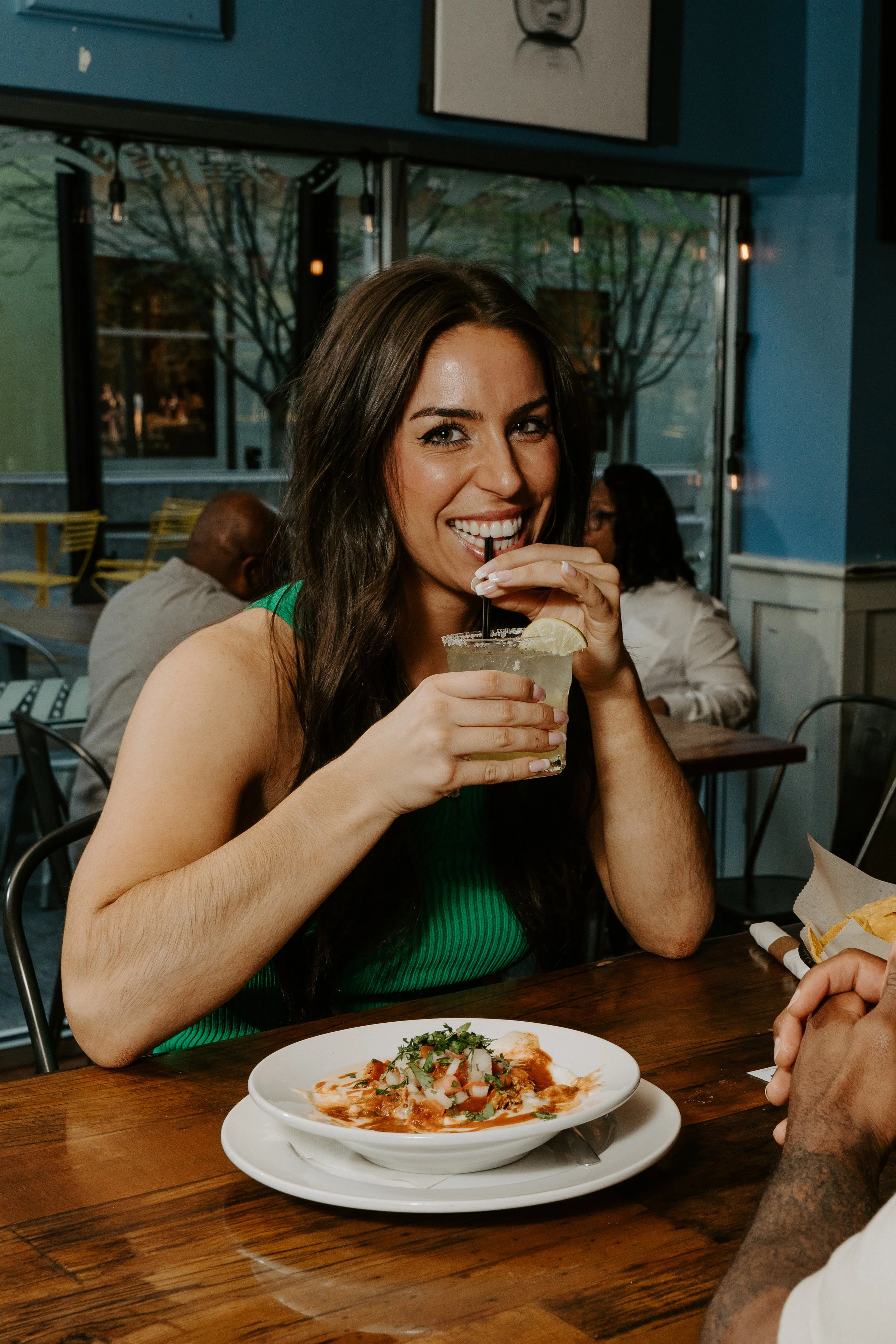 A woman with long dark hair smiling and sipping a margarita at a restaurant table with a plate of food, wearing a green top.