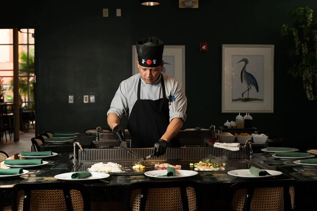 Portrait of a hibachi chef cooking rice on a griddle in moody lighting.
