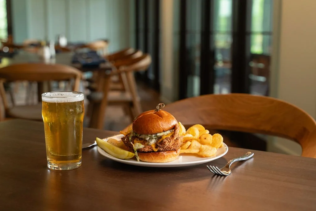 A plate with a fried chicken sandwich and fries on a wooden table, with a glass of beer nearby in a restaurant setting.