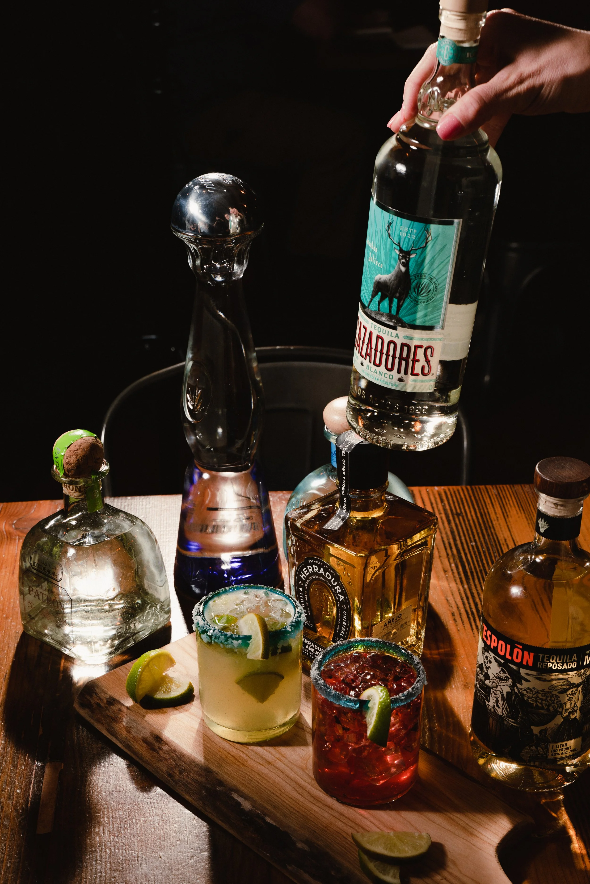 Assorted bottles of liquor, two colorful cocktails garnished with lime wedges and salt-rimmed glasses, on a wooden serving board, with a dark background.